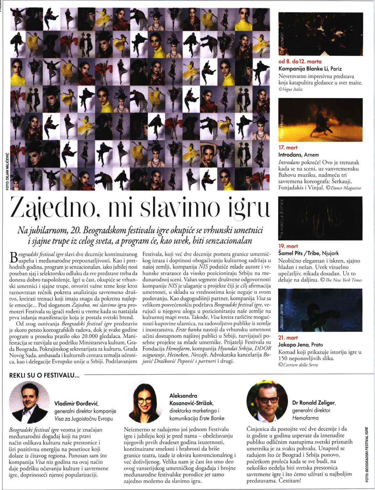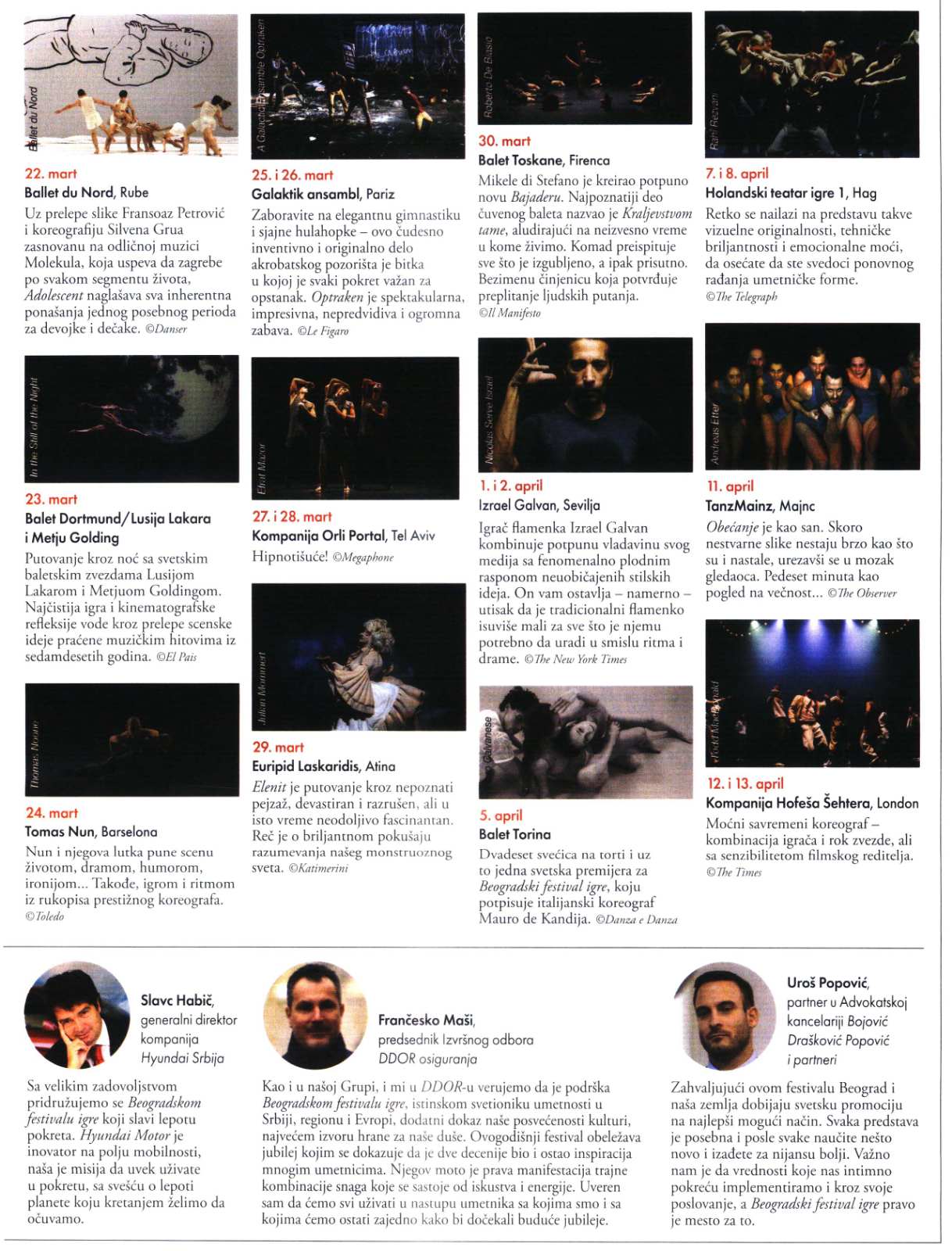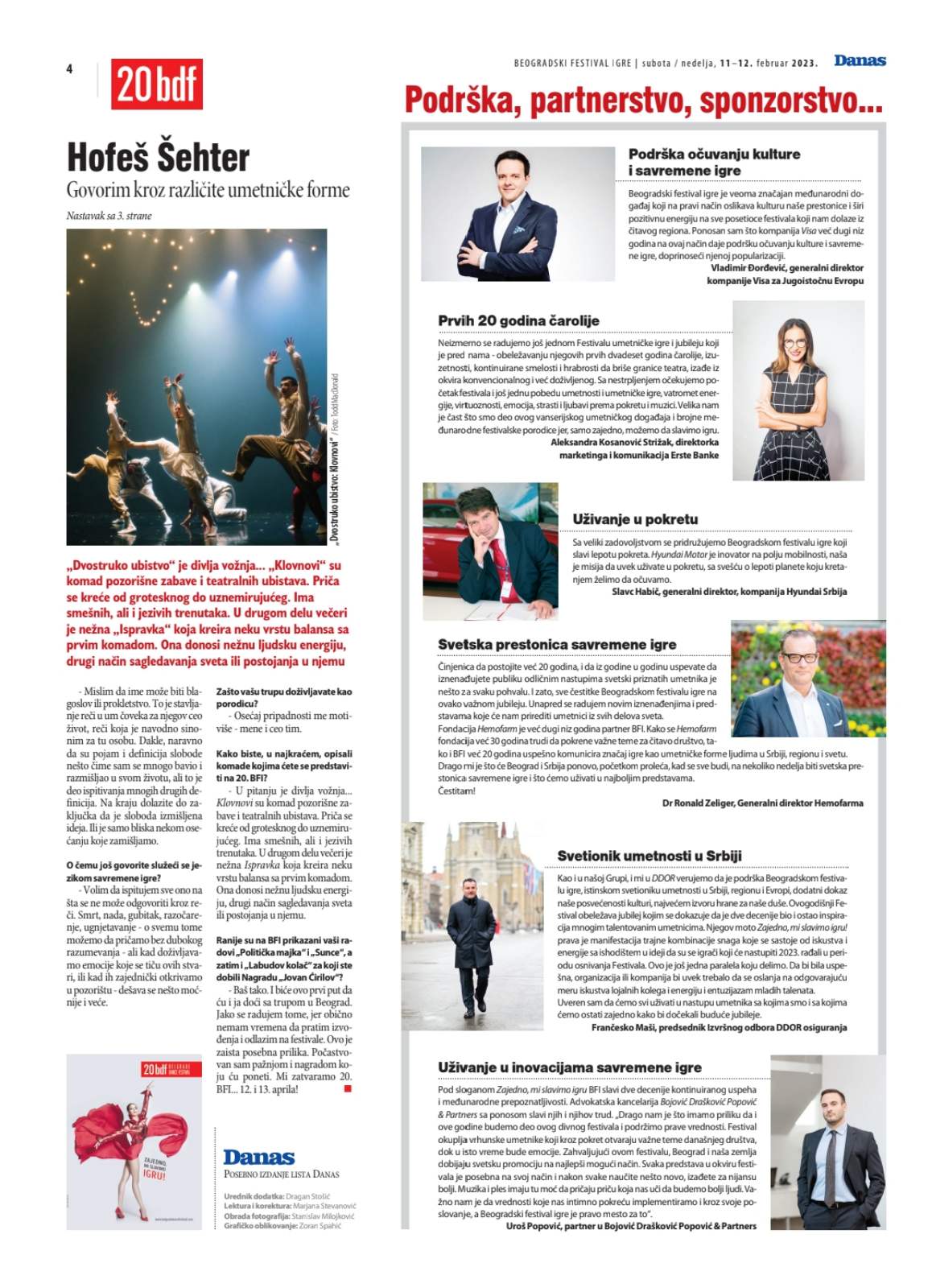„Drago nam je što imamo priliku da i ove godine budemo deo ovog divnog festivala i podržimo prave vrednosti. Festival okuplja vrhunske umetnike koji kroz pokret otvaraju važne teme današnjeg društva, dok u isto vreme bude emocije. Zahvaljujući ovom festivalu, Beograd i naša zemlja dobijaju svetsku promociju na najlepši mogući način. Svaka predstava u okviru festivala je posebna na svoj način i nakon svake naučite nešto novo, izađete za nijansu bolji. Muzika i ples imaju tu moć da pričaju priču koja nas uči da budemo bolji ljudi. Važno nam je da vrednosti koje nas intimno pokreću implementiramo i kroz svoje poslovanje, a Beogradski festival igre je pravo mesto za to.“ – rekao je Uroš Popović, partner u BD2P.